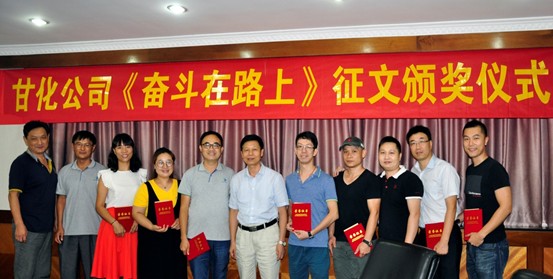 2018年8月17日下午,在甘化大廈15樓會議室,公司黨委、工會舉辦《奮斗在路上》獲獎征文頒獎儀式。本次活動共收到征文11篇,參賽征文經專業評委評選,獲獎10篇。公司各支部委員、工會委員和征文作者共16人參加了會議。